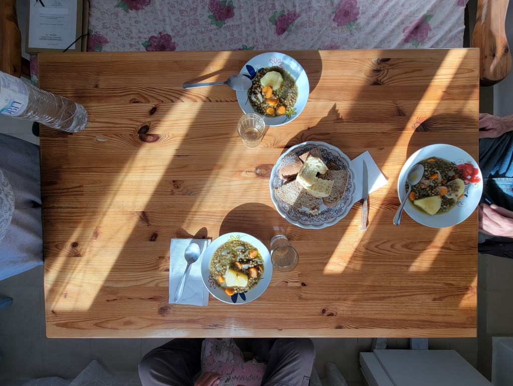 “SIT DOWN,” he ordered in the blunt Greek fashion. The four of us had been harvesting Βασιλης’ olive trees and, rather than pushing to finish quickly, he insisted we rest. During the mid-morning break, he made ready a shady outdoor table with water, dried figs from his farm, and crunchy biscuits. During the lunchtime break, we gathered at the Table inside the house and away from the sun for a fully cooked meal. What a great example of Christlike service.